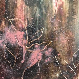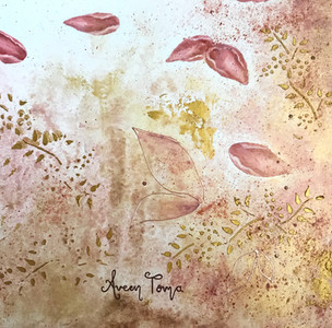 This painting attempts to showcase what may be taking place as time passes. This girl is enveloped in a murky, withered state because of her sufferings, and as a result, cannot see beyond her undesirable condition. Yet a working clock (depicting the passage of time) gradually draws away the petals of the bloody flowers that have blinded her. These petals drift away while gently lightening in color and forming the hours of the clock. The transition bleeds into a lighter world- the world to come- which is depicted with rosy shades, golden leaves, and light. Though this piece captures this gradual yet beautiful time of revelation in a single image, this transition may have actually occurred over many years- or even a lifetime.